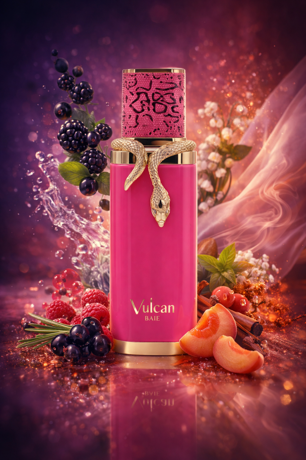 A Vulcan Baie nyitánya élénk és vibráló, ahol a feketeribizli és a szeder lédús, mély gyümölcsössége találkozik a bergamott friss ragyogásával, miközben a rozmaring aromás zöldessége finom kontrasztot ad a kompozíciónak; az első benyomás energikus, modern és enyhén játékos, mintha egy elegáns gyümölcsös koktél bontakozna ki a bőrön; a szívben a málna édes-savanykás karaktere és a vodka hűvösen tiszta akkordja különleges, szinte pezsgő hatást kelt, amelyet a bazsalikom zöld frissessége és a gyöngyvirág lágy nőiessége egyensúlyoz ki; az alapban az eper és az őszibarack selymes édessége olvad össze a pézsma tiszta aurájával, miközben a pacsuli, a szantálfa, az ámbra és a tömjén melegebb, mélyebb, enyhén füstös hátteret biztosít – összességében egy karakteres, gyümölcsösen érzéki és modern női illat, amely egyszerre játékos és magabiztos, tökéletes választás esti programokra vagy különleges alkalmakra.